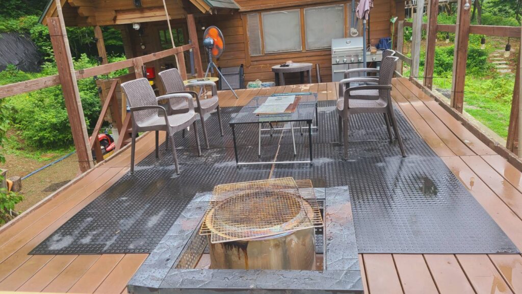 広いデッキでバーベキューやファイヤーピットでの焚火等が楽しめます。